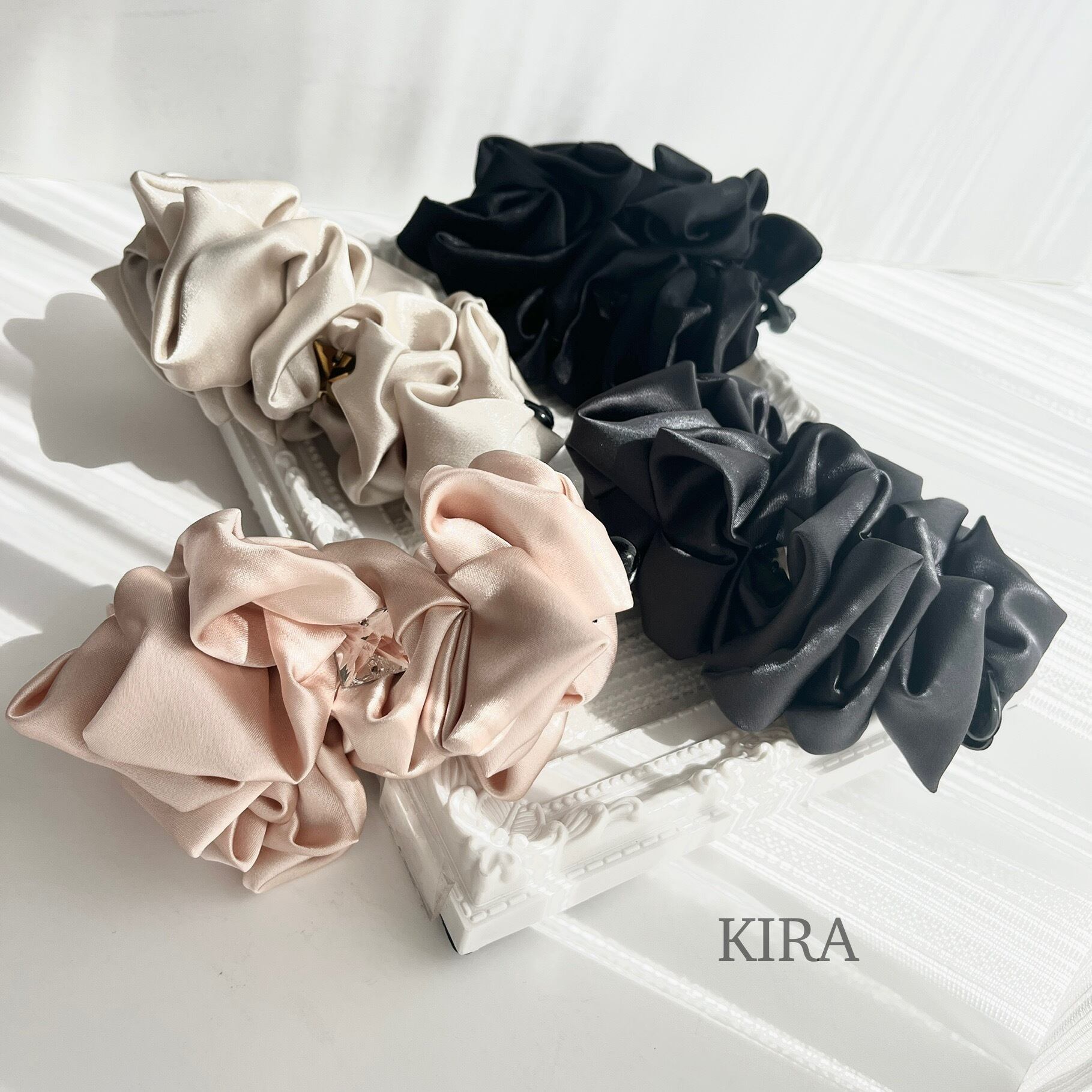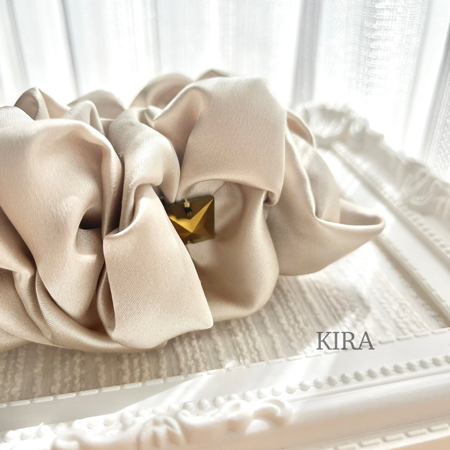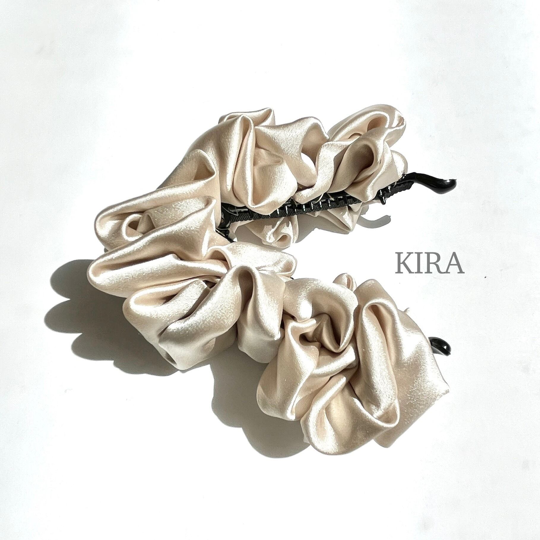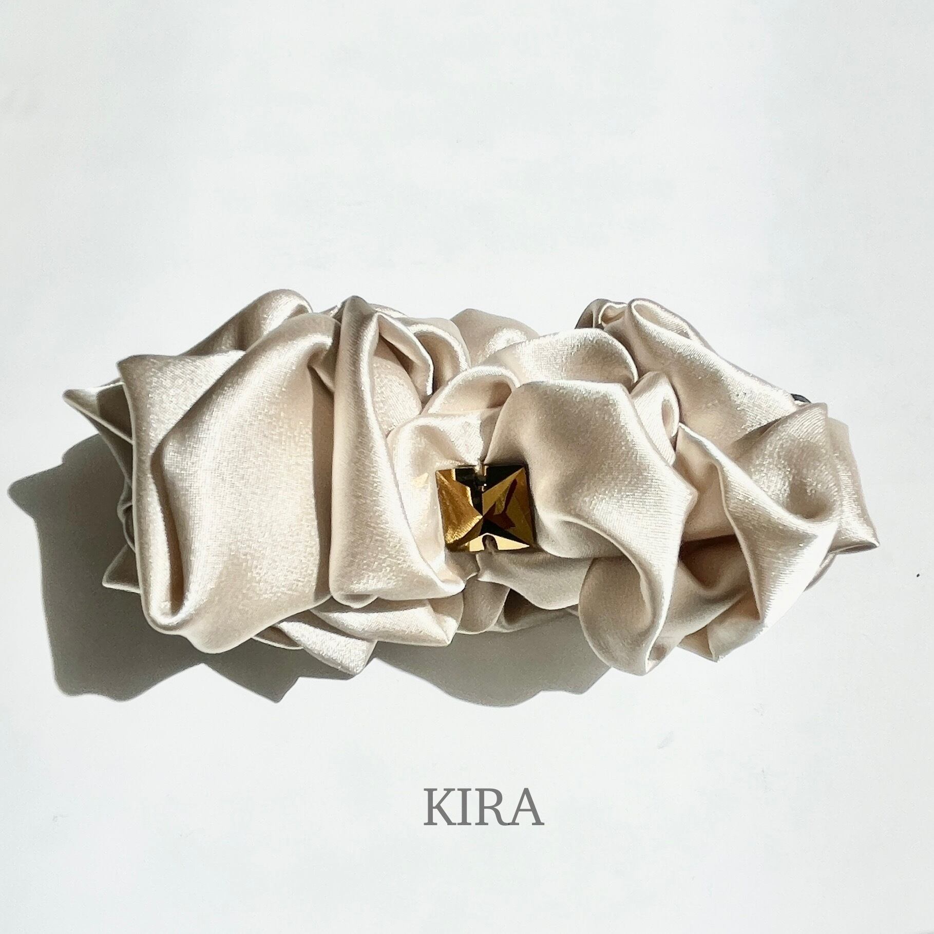 ボリューミーなギャザーの中心に、キラリと光るクリスタルパーツをポイントに施し、見え隠れする事でセレブレーションにもカジュアルにも合わせやすい、エレガントで気品あるバナナクリップに仕上げました。