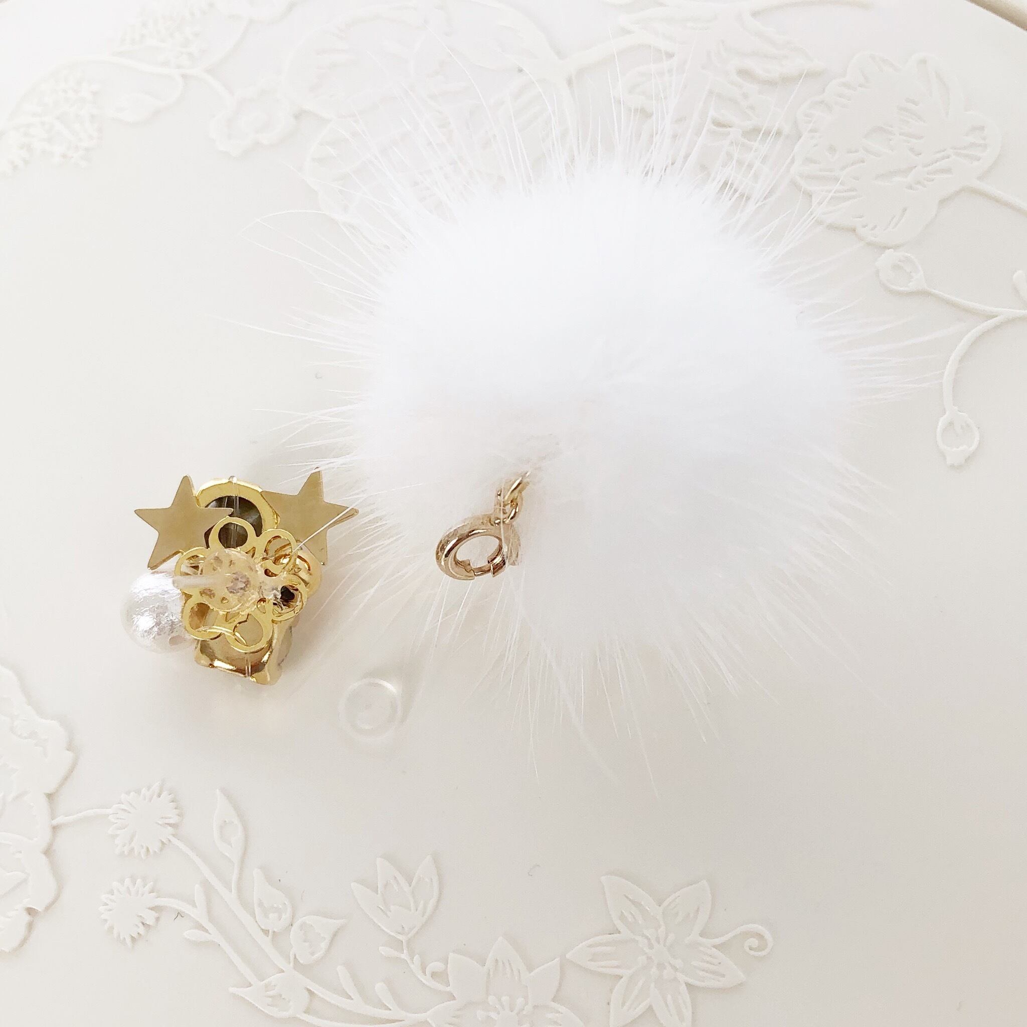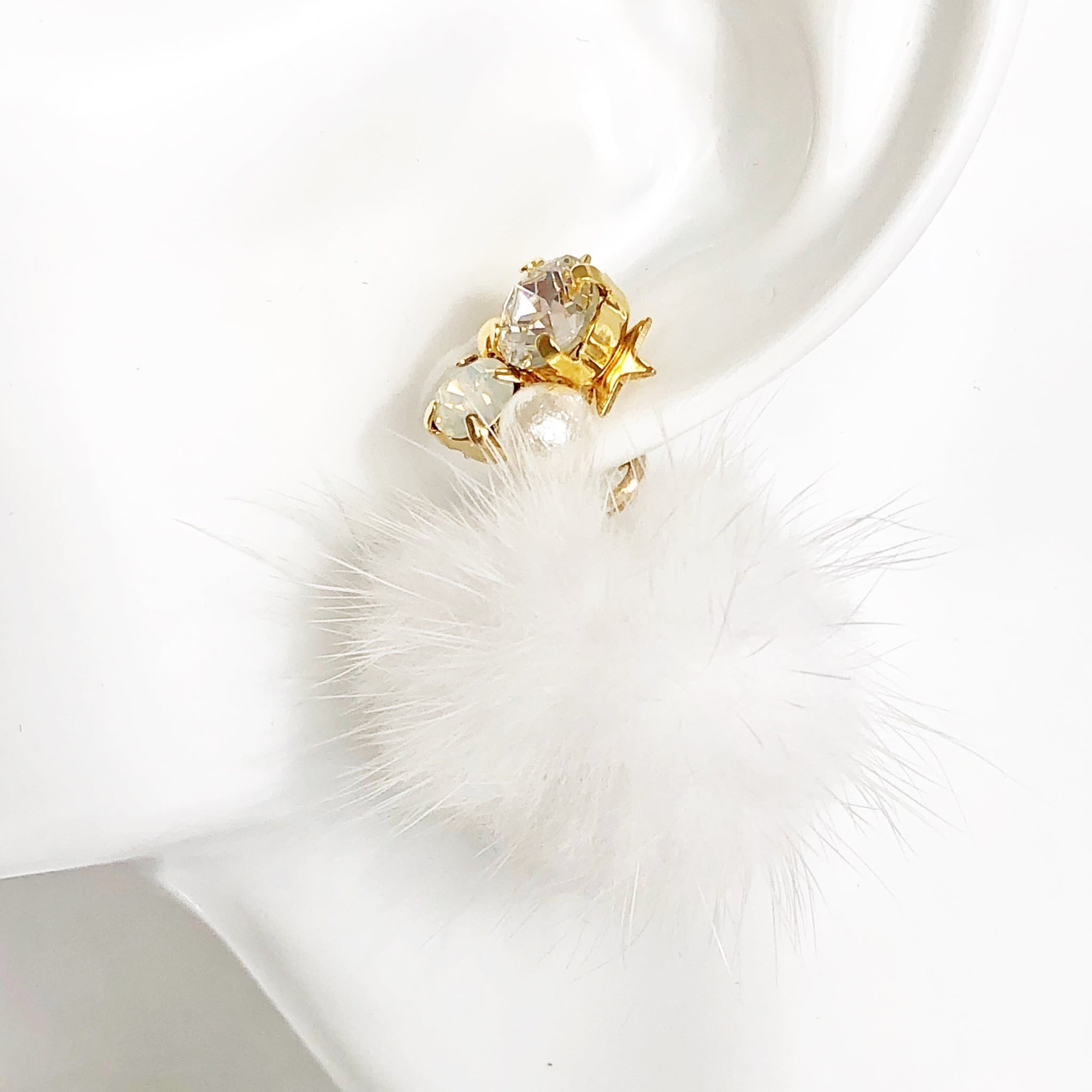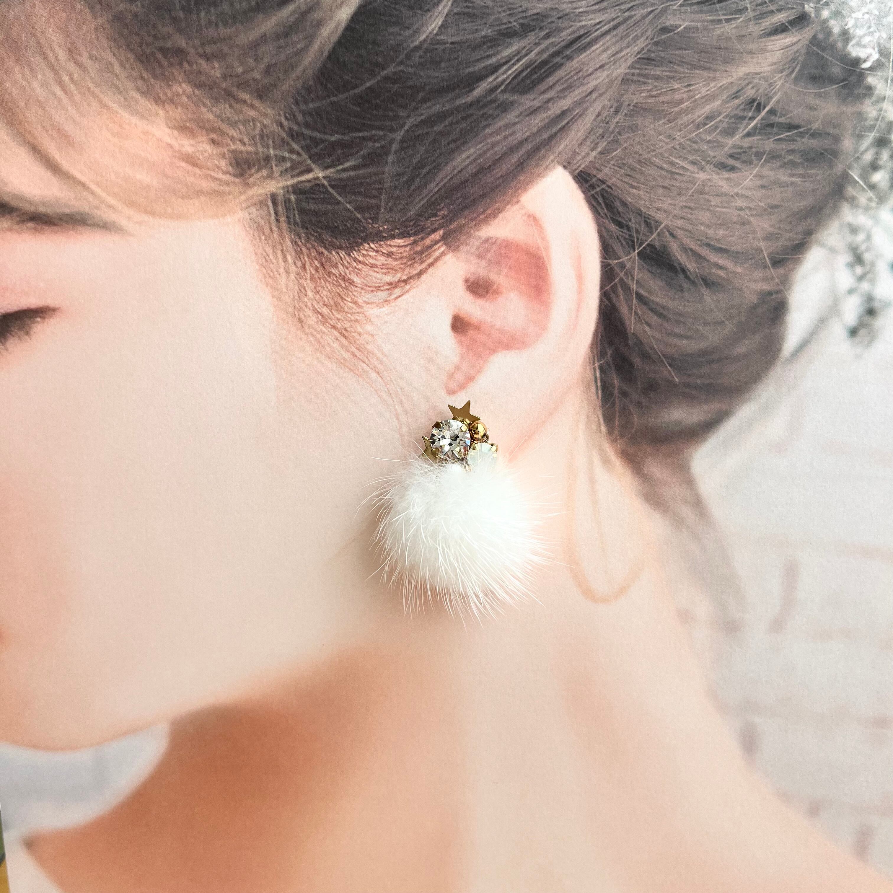ミンクファーをはずして頂くと,クリスタルやコットンパール、星形メタルがアクセントのキラキラピアスにチェンジし、オールシーズンお使い頂けます。
