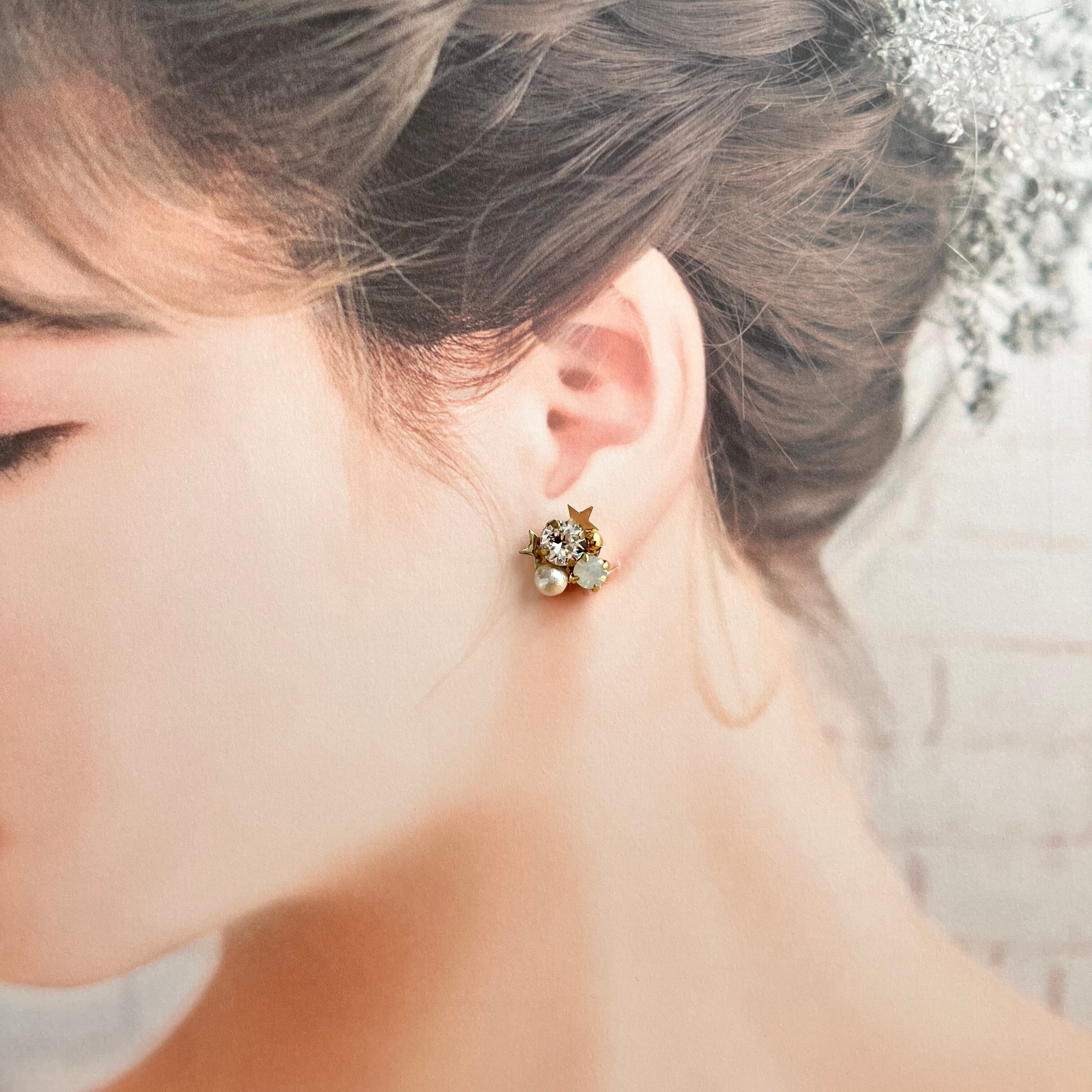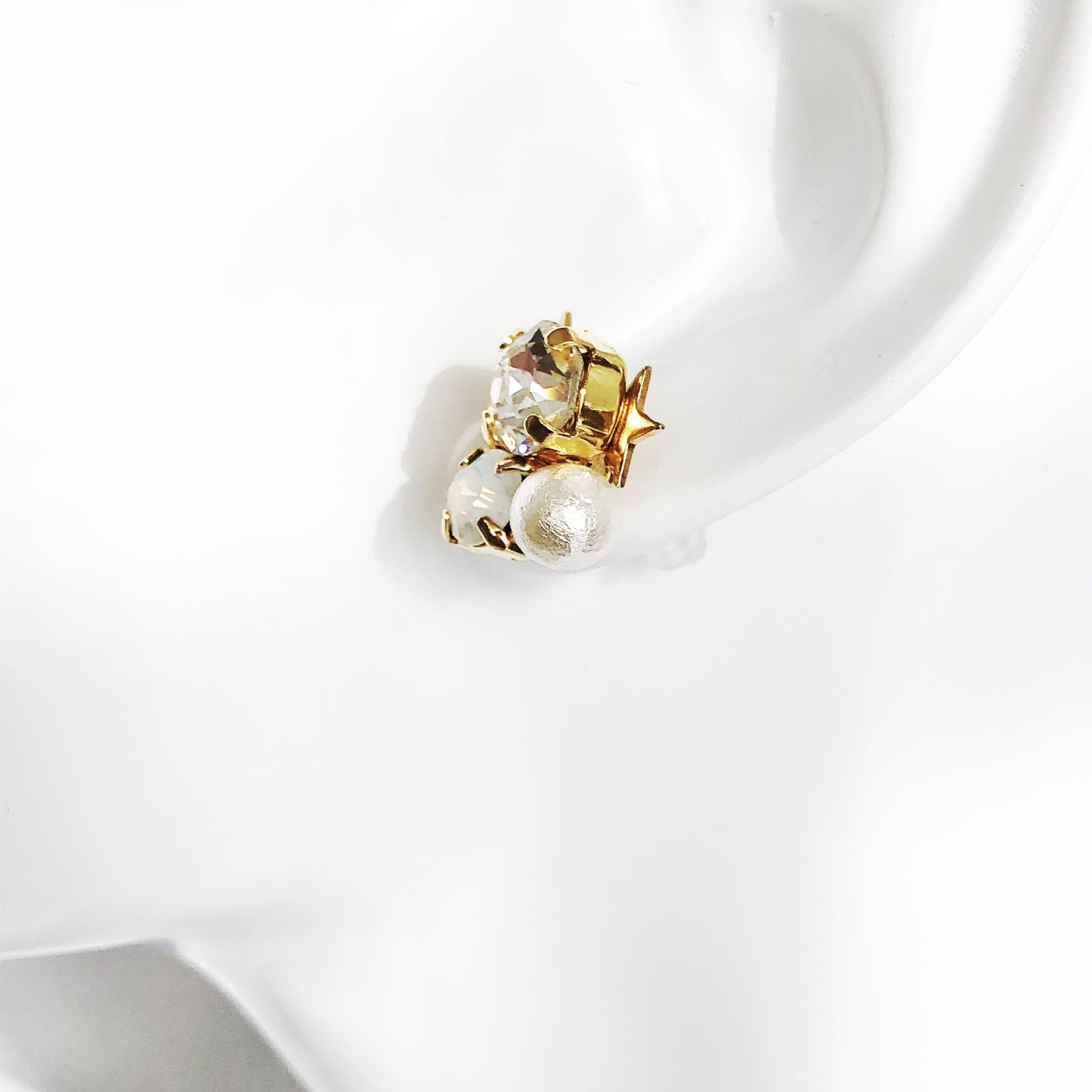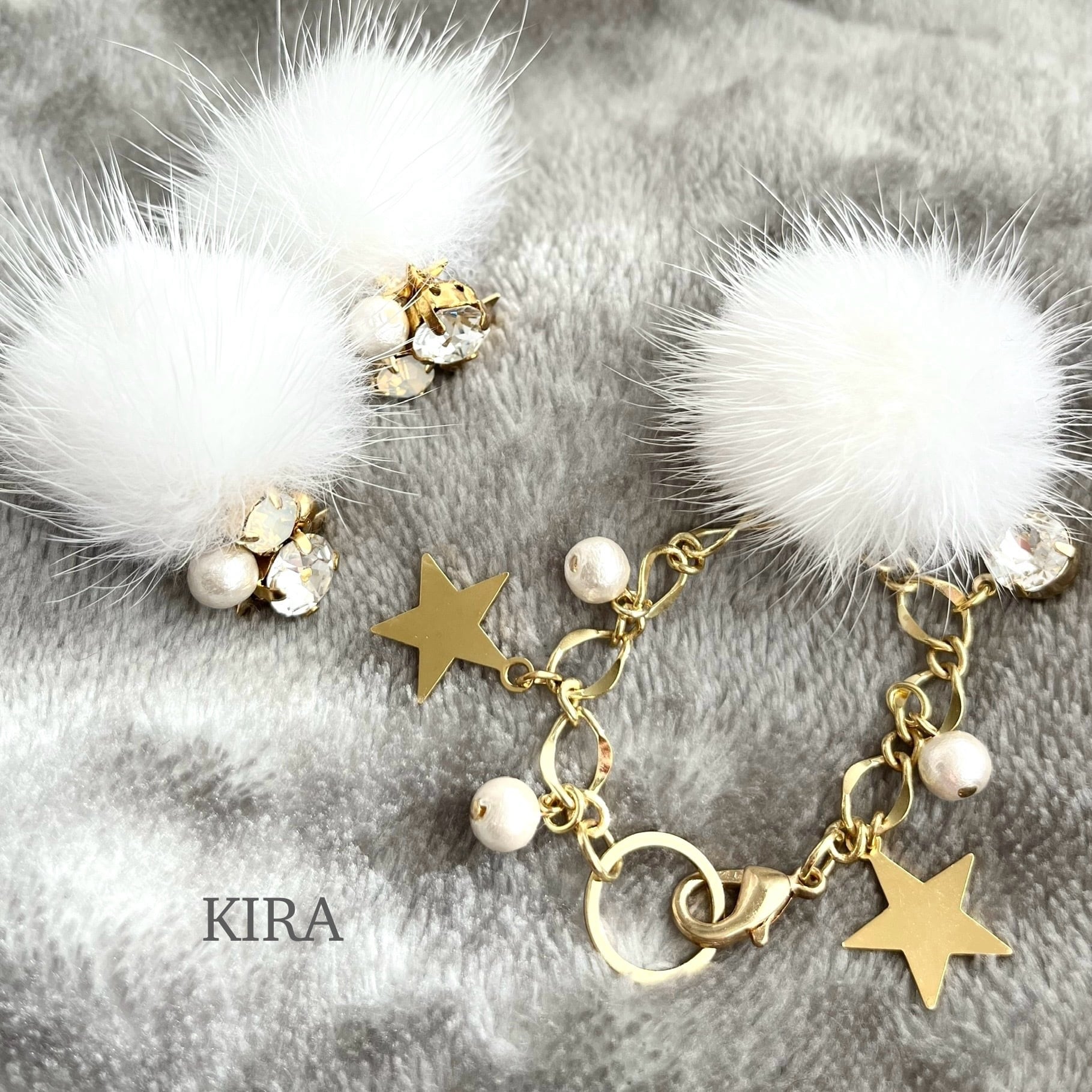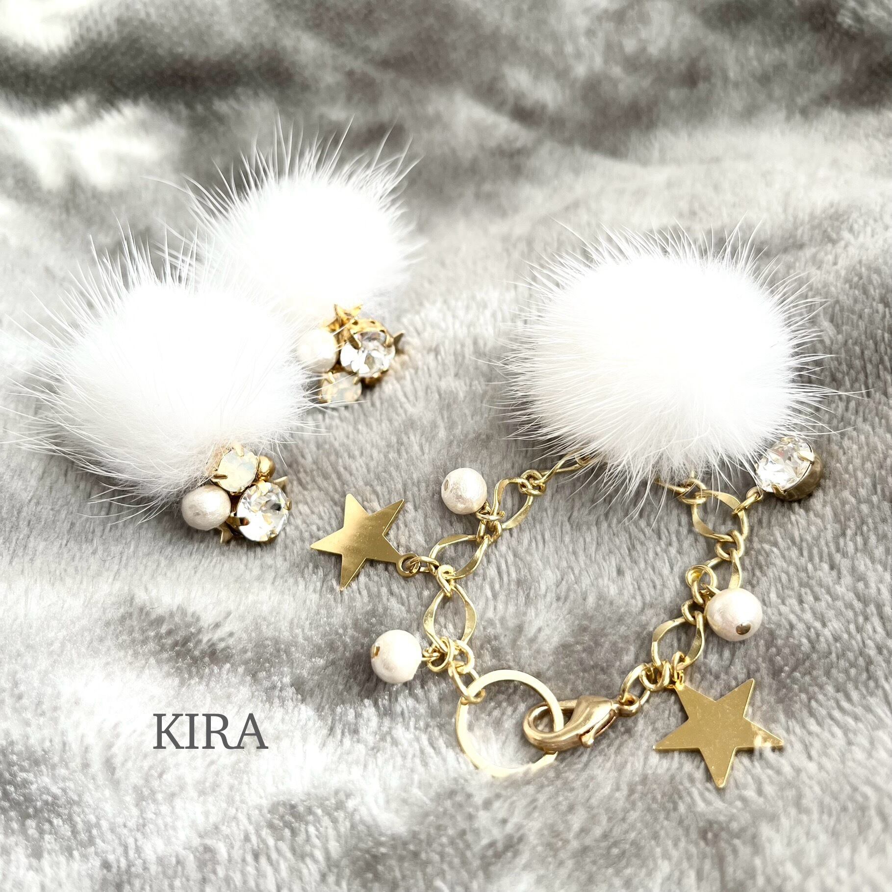 ミンクファーをはずして頂くと,クリスタルやコットンパール、星形メタルがアクセントのキラキラピアスにチェンジし、オールシーズンお使い頂けます。