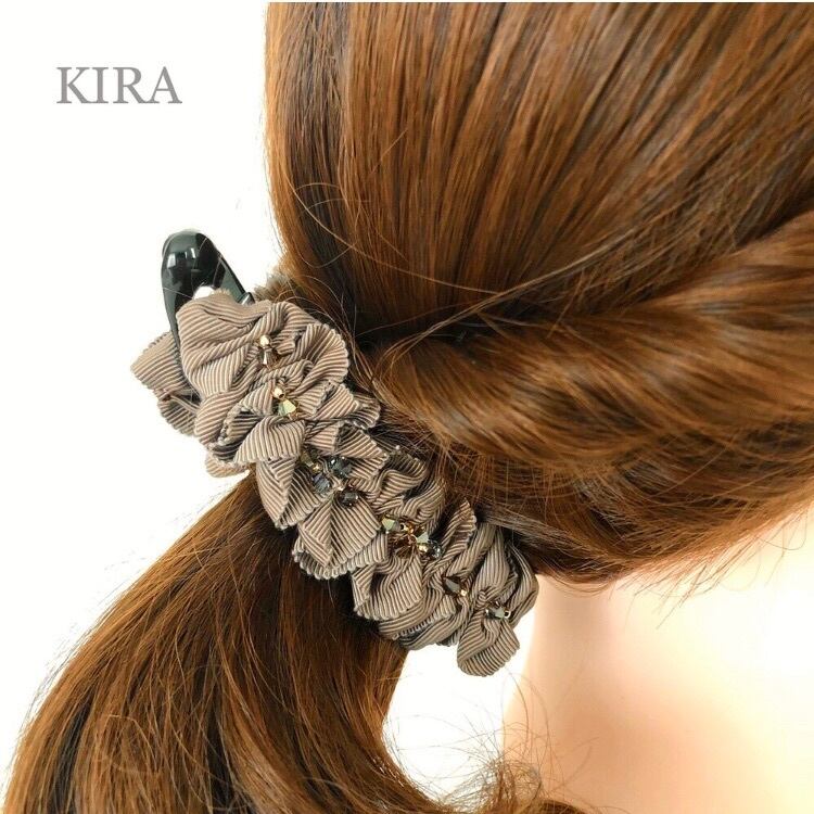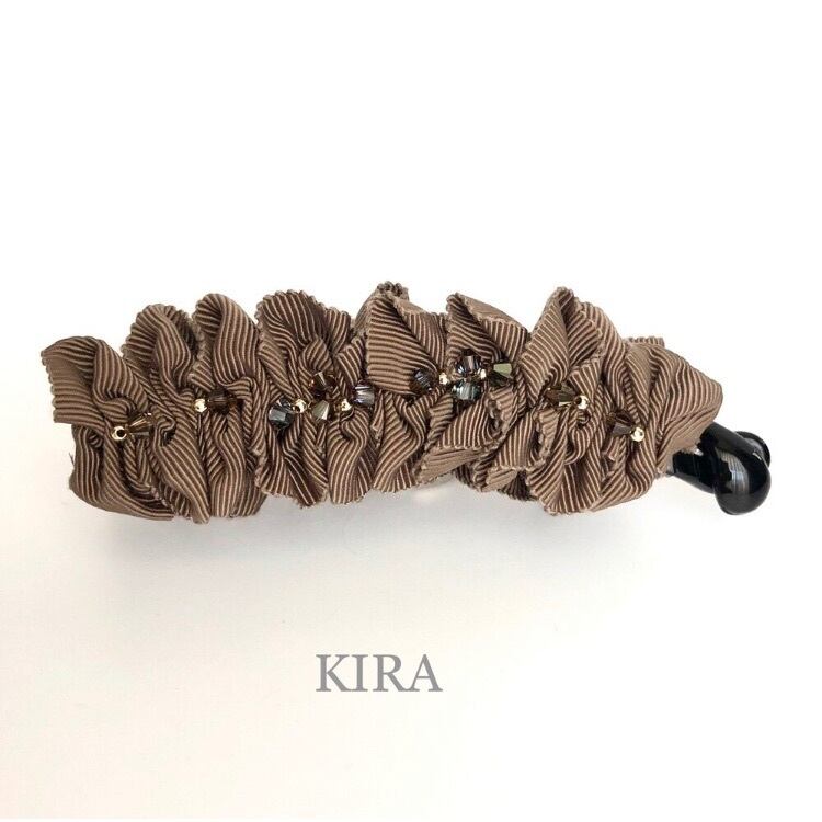 グログランリボンのフリルデザインに、シンプルな輝きのクリスタルを施したバナナクリップです。