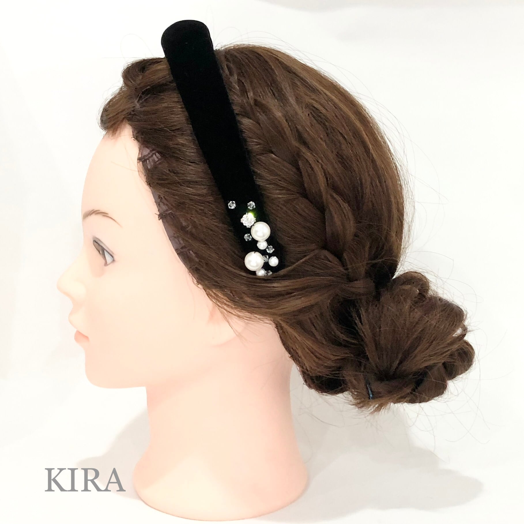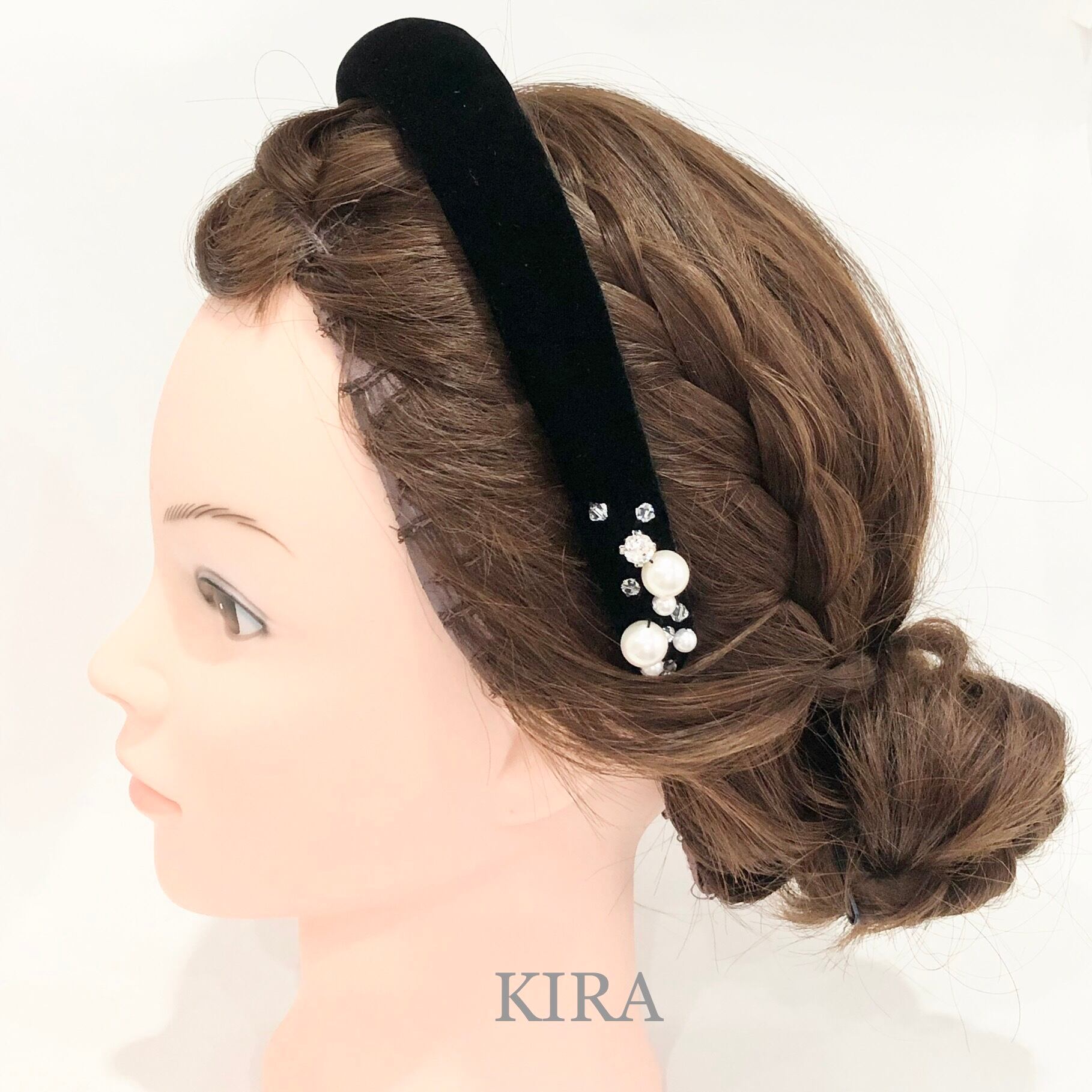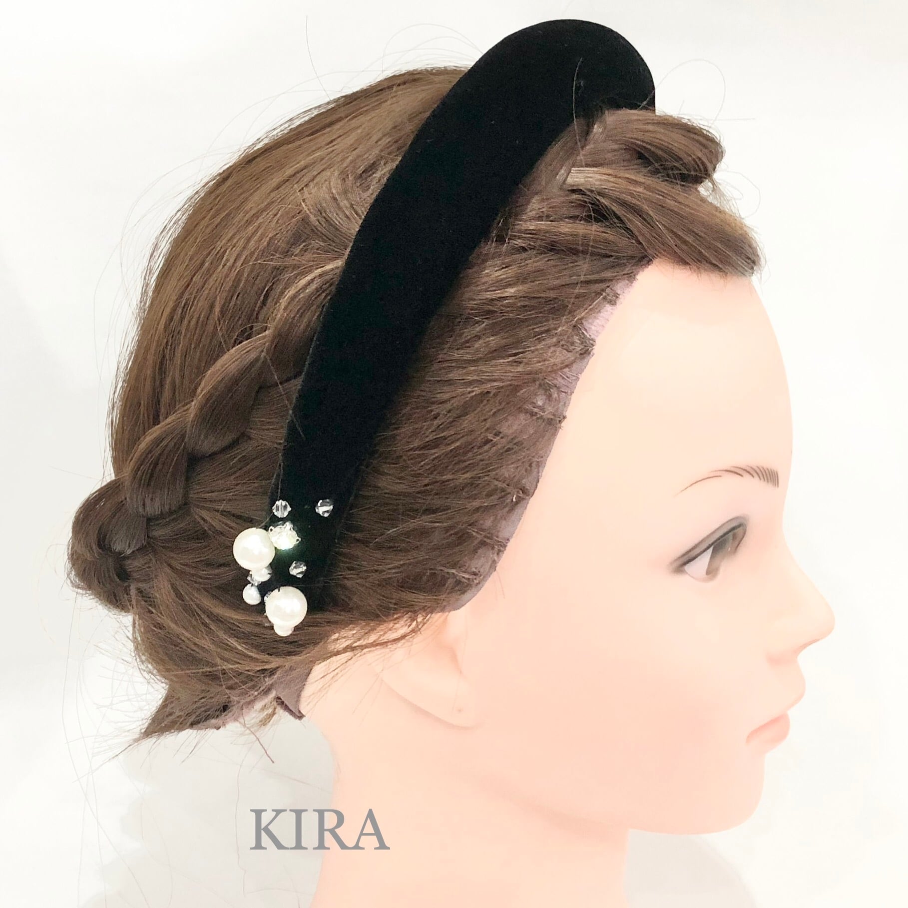 今流行りの少し太めのベルベットカチューシャに、耳元を煌びやかにパールとクリスタルを施しました✨