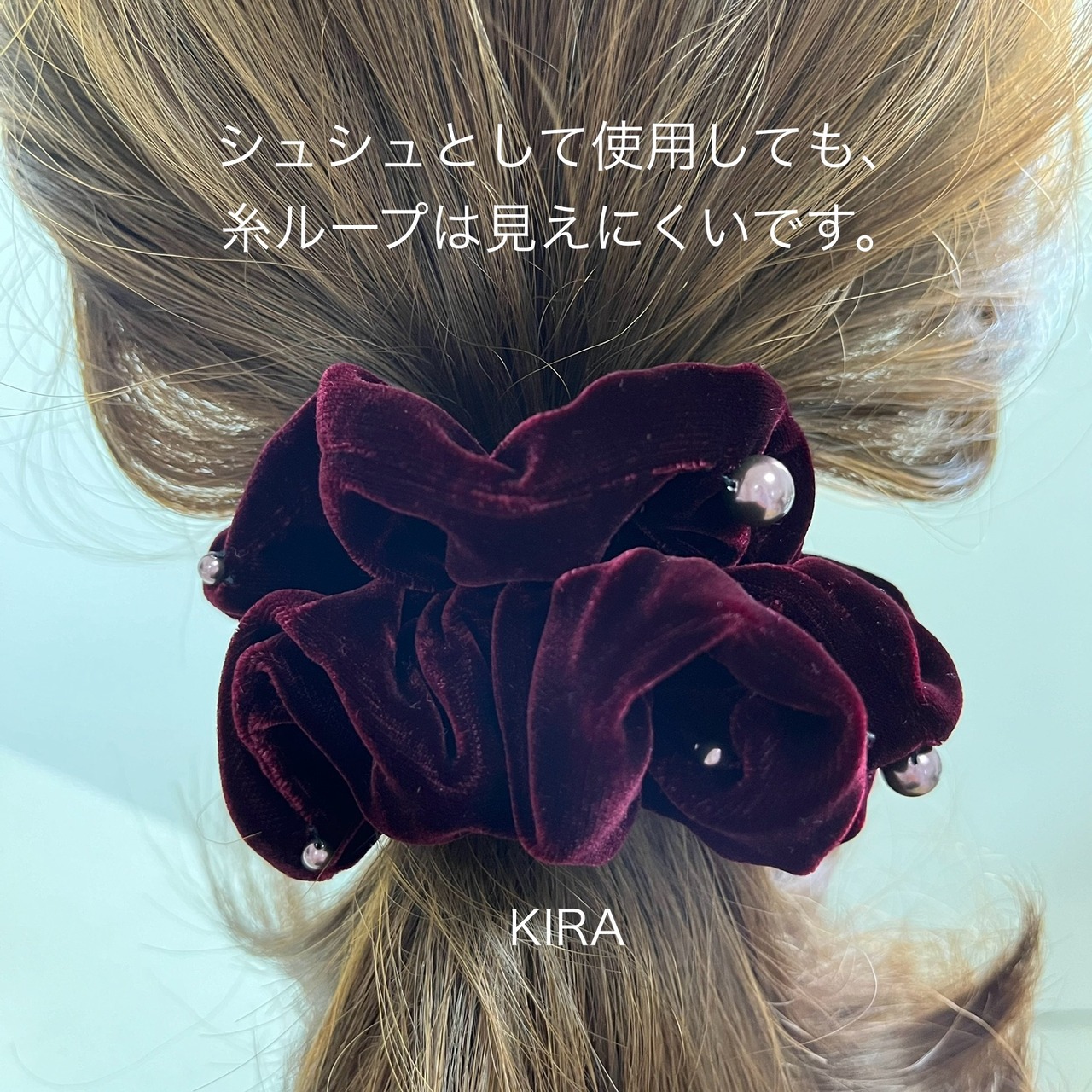 一度ヘアゴムでしっかり結んでいただいてから、シュシュを飾っていただくことを、おすすめいたします。